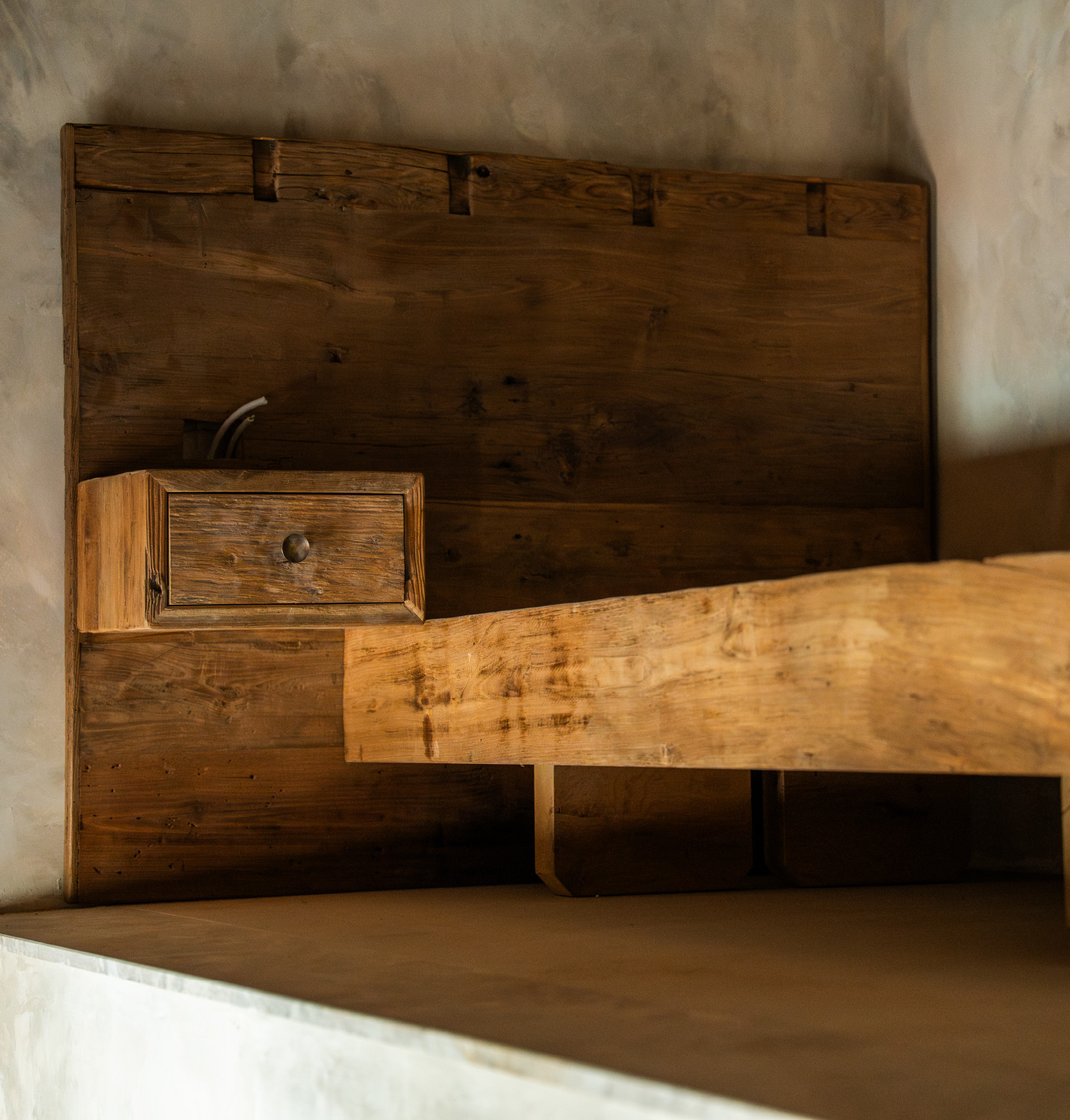 Yatak platformu ve başlık tasarımında tek parça bloklar tercih edildi. Ahşabın yoğun damar yapısı, taş ve tuğla yüzeylerle birlikte mekâna zamansız bir derinlik kattı. Komodin ve sabit mobilyalarda da aynı malzeme dili devam ettirilerek bütünlüklü bir atmosfer sağlandı.Tavan kirişleri ve duvar kaplamalarında doğal yüzey korunarak yalnızca yağ ile hafifçe sabitlendi. Işıkla temas eden her yüzey, ahşabın kendi ton geçişlerini ortaya çıkarıyor; mekânın ruhunu güçlendiriyor.