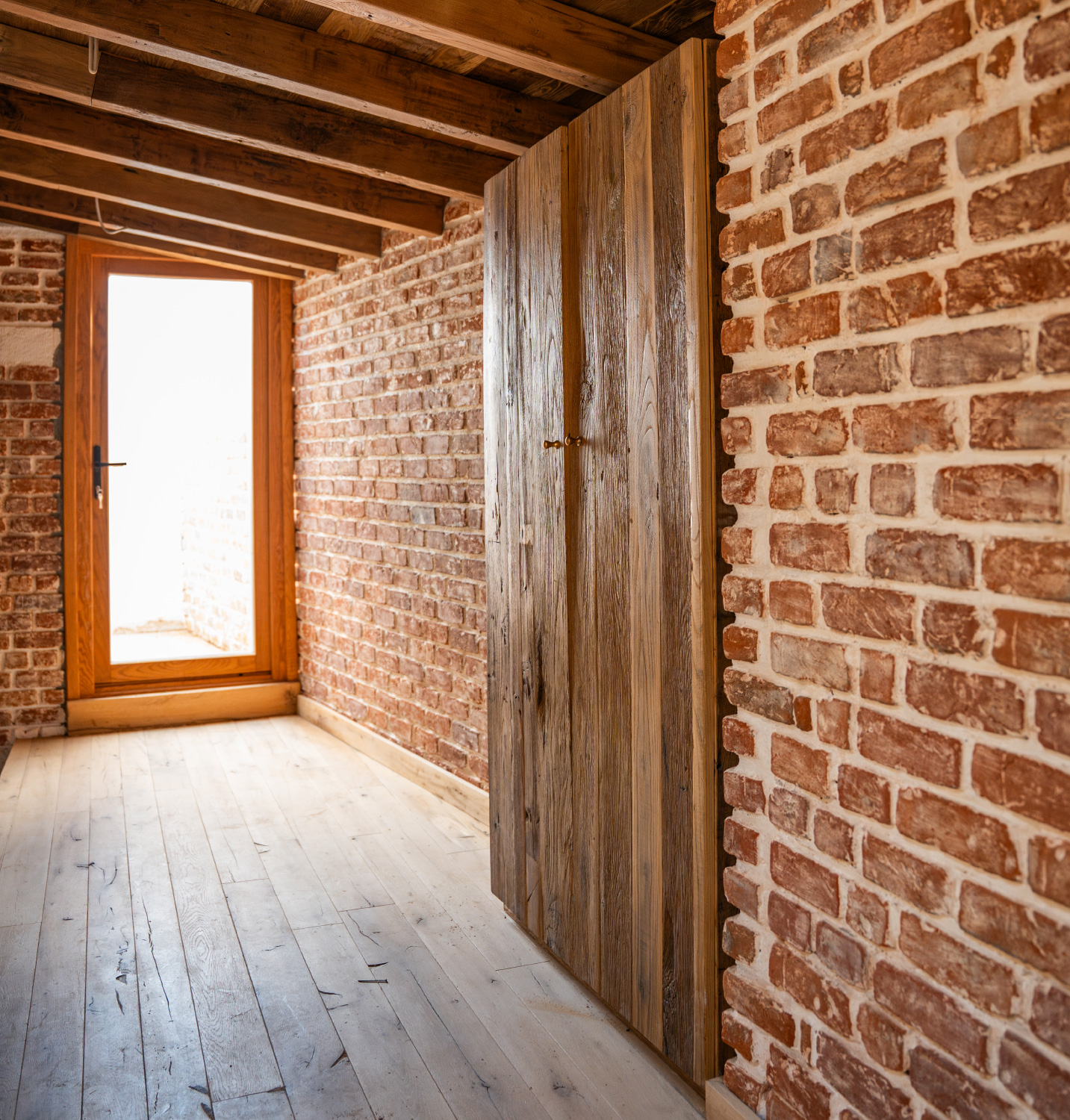 Bu projede, Kumdo Otel’in iç mekânlarında doğal dokusunu kaybetmemiş masif ahşap uygulamalar gerçekleştirdik. Yılların izini taşıyan kestane ve meşe yüzeyler, minimal müdahale ile işlendi; budaklar, çatlaklar ve damar geçişleri gizlenmeden bırakıldı. Amaç kusursuzluk değil, karakterdi.Oda kapılarında kullanılan masif paneller, siyah metal kol ve kilit detaylarıyla birlikte güçlü bir kontrast oluşturdu. Sürgü sistemlerinde endüstriyel metal ile ham ahşap dengelendi; sıcaklık ve netlik aynı çizgide buluşturuldu.