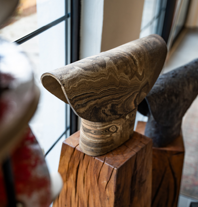 Pedestallerimiz: Doğal budaklar, derin çatlaklar ve zamanın aşındırdığı yüzey izleri korunarak yalnızca doğal yağlarla hafifçe korundu – brutal ama davetkar bir zemin yaratarak seramiklerin organik formlarını, dalgalı kenarlarını ve toprak tonlarını ön plana çıkarıyor. Siyah çerçeveli aydınlatmalı raf sistemi ise seramik koleksiyonunu (bej, siyah, gri tonlarda kaseler, tabaklar, heykelsi parçalar) loş ışıkla dans ettiriyor; ahşap detaylarla bütünleşerek mekanlara hem sanat hem de sıcak bir ambiyans katıyor.