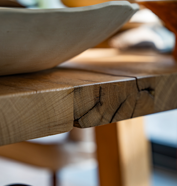 Bu projede, Alaçatı’nın bohem ruhunu taşıyan Terra Marique Ceramic atölyesinin el emeği stoneware seramiklerini, bizim hikayesi olan reclaimed ahşap taşıyıcılarımızla buluşturduk. Seramikler Anadolu toprağından elle şekillenip ateşle doğarken, biz de eski köy kirişlerinden kestane ve meşe blokları tek parça kesimle işledik.